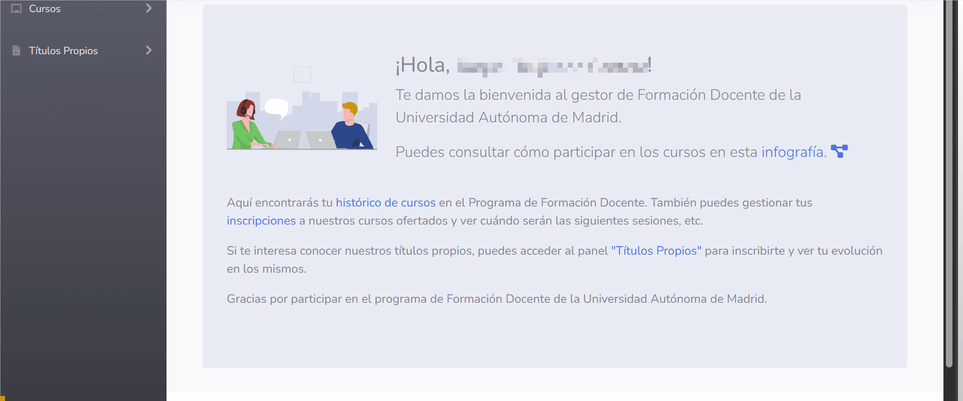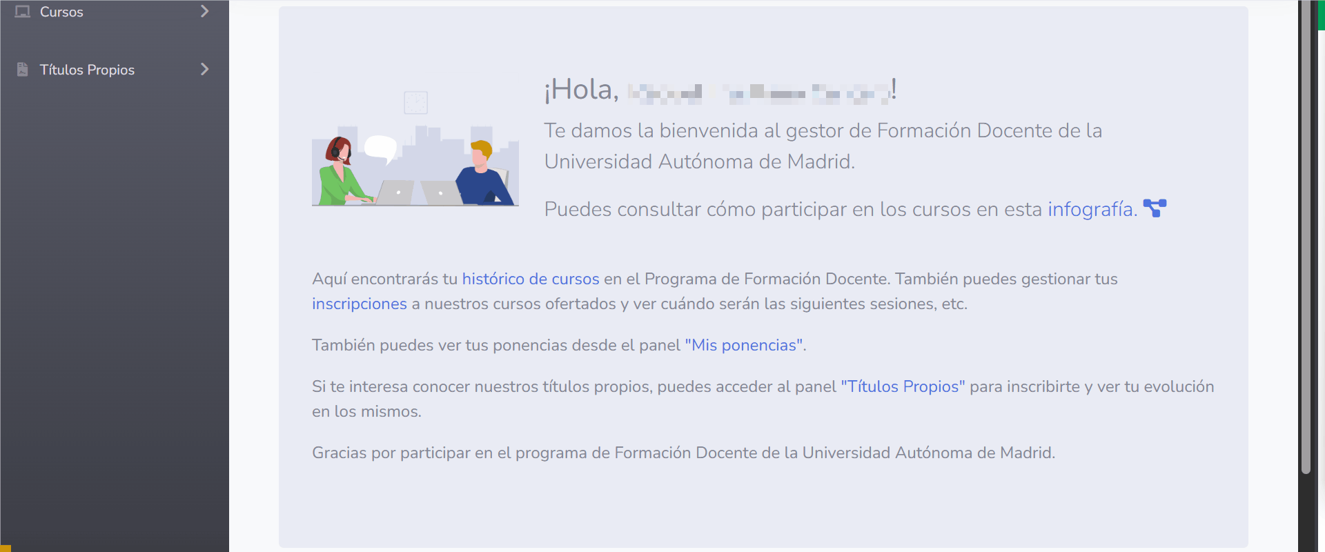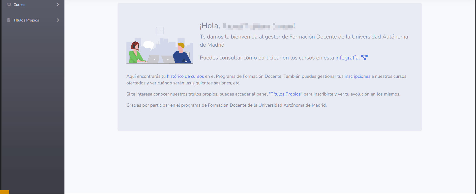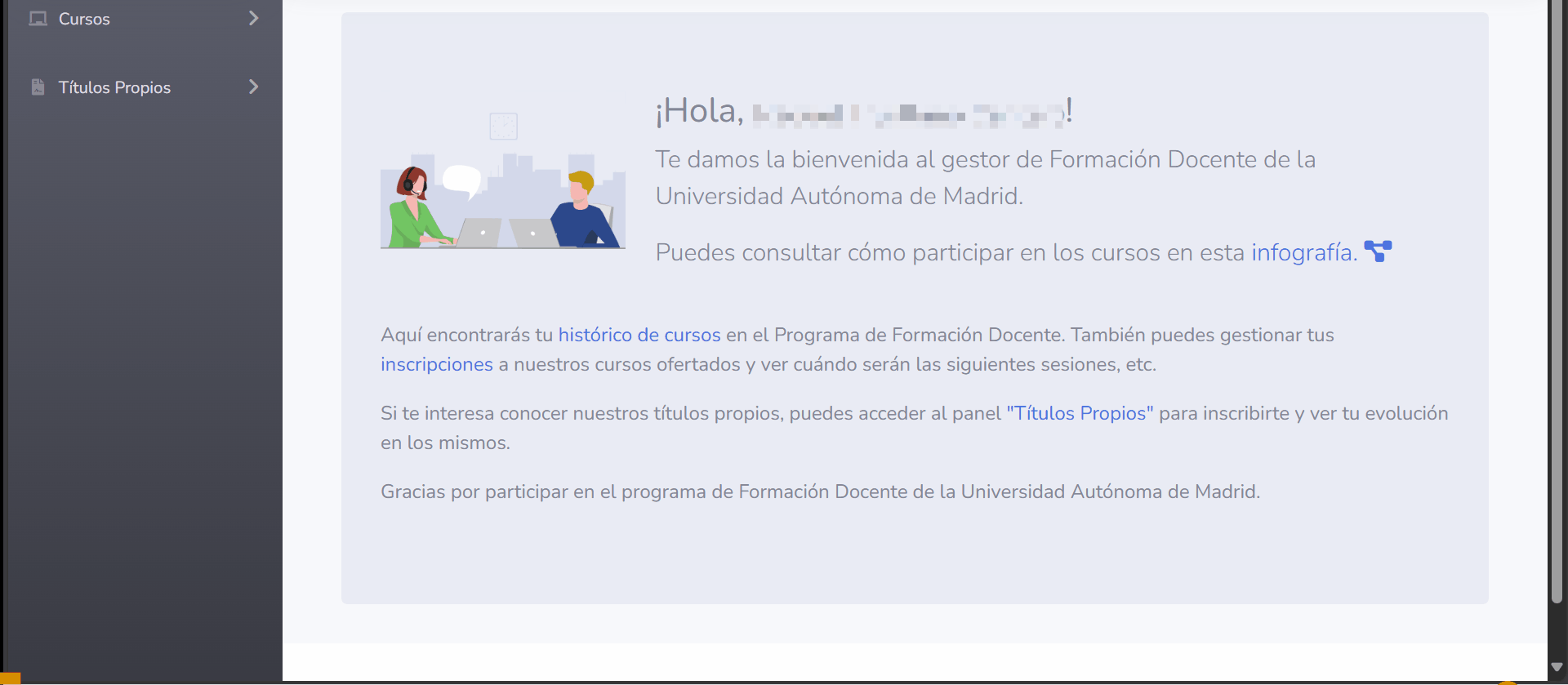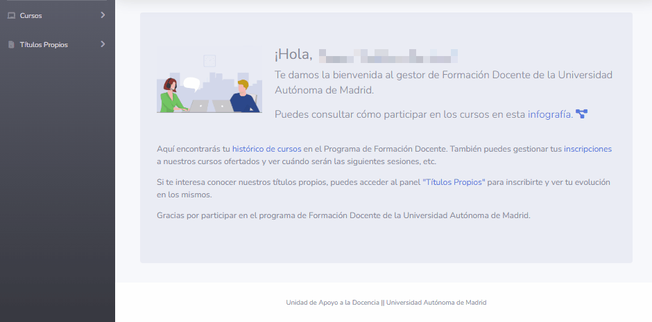 ***IMPORTANTE, estar inscrito no significa que ya puedas hacer el curso, normalmente se reciben más inscripciones que plazas tiene el curso por lo que recibirás, entre 15-20 días antes del comienzo del curso al que te has inscrito, un email enviado desde noreply.formacion.docente@uam.es dónde se te notifica si has sido seleccionado o si quedas en lista de espera. Si eres seleccionado tendrás que entrar de nuevo en la plataforma para confirmar tu asistencia. Por favor comprueba que los email desde noreply.formacion.docente@uam.es no se te van a la carpeta de SPAM de tu email.