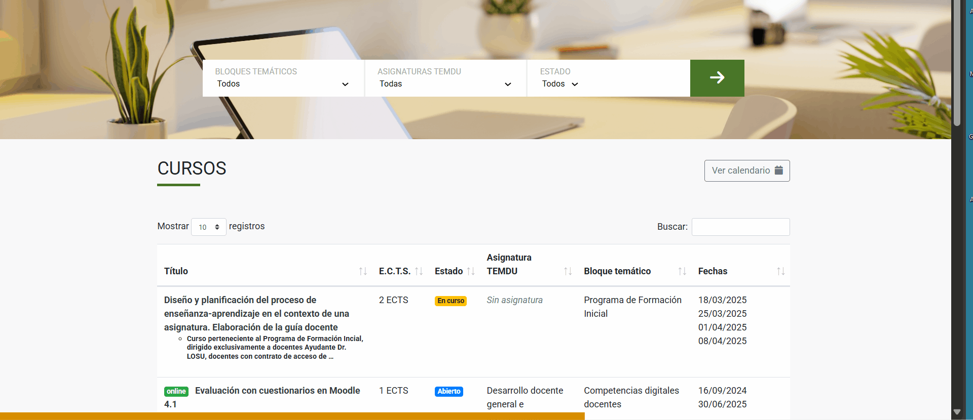 Puedes filtrar los cursos por bloques temáticos, asignaturas del TEMDU (Título de Experto/a en Metodología Docente Universitaria), estado, ordenar la tabla por columnas, o buscar por texto.