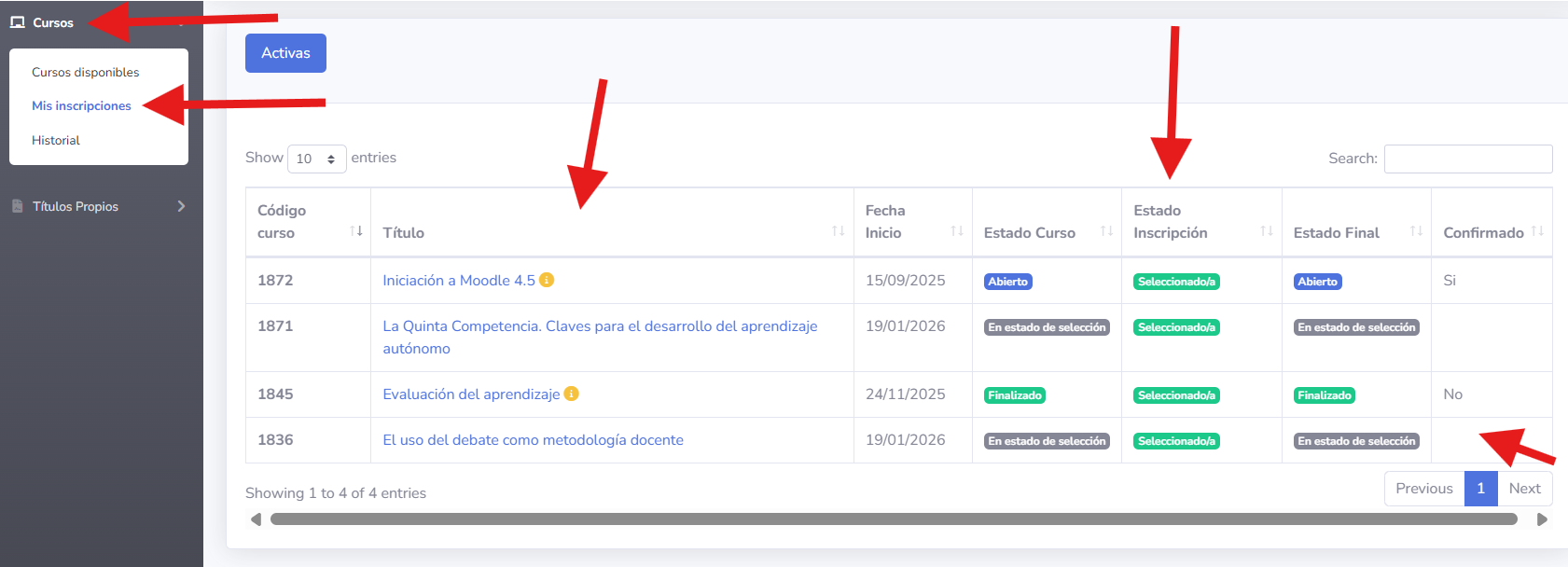 Tienes que entrar en “Cursos” “Mis inscripciones”, buscar el curso y mirar en la columna “Estado de inscripción”, si aparece como: