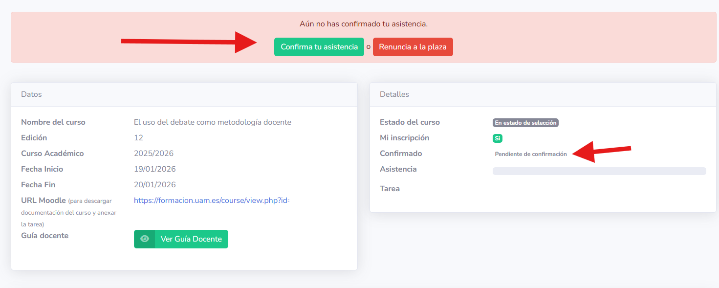 Buscar el curso, pinchar en el nombre y darle al botón "Confirma tu asistencia" o "Renuncia a la Plaza". Para confirmar si lo has hecho bien, al volver a la tabla, te aparecerá en la última columna, la de Confirmado, "Si" si has aceptado la plaza o "No" si la has rechazado, en caso de que no aparezca nada es que todavía tienes que confirmar o renunciar a la plaza.
