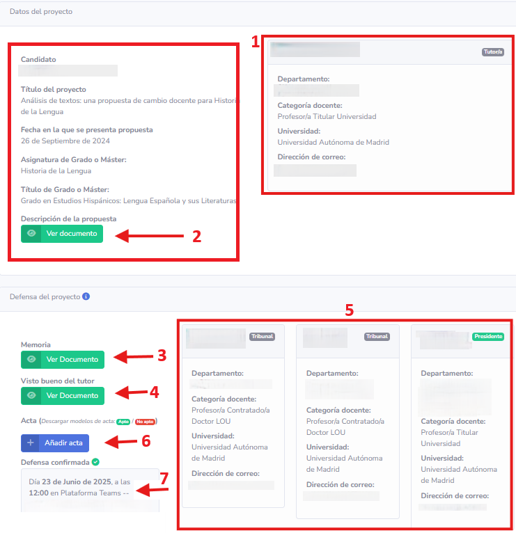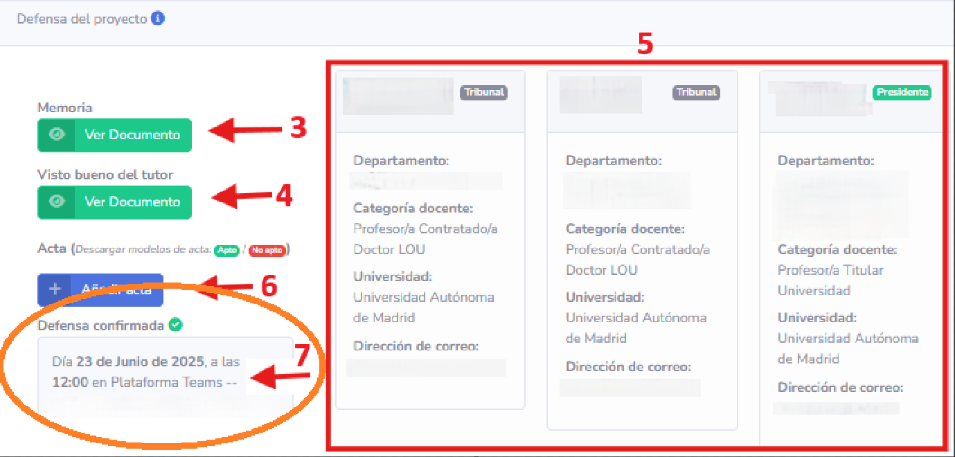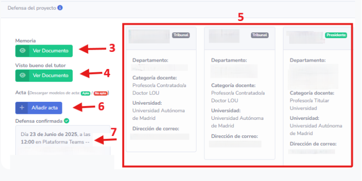Mira el apartado anterior del tutorial, la fecha aparece al final de los Datos del proyecto (7) dónde pone Defensa confirmada.