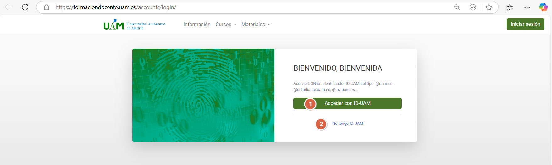 - Iniciar sesión en el gestor y acceder con el ID-UAM (correo electrónico y contraseña habituales) si forma parte de la UAM (1) o bien desde “No tengo ID-UAM” si no forma parte de esta institución (2).